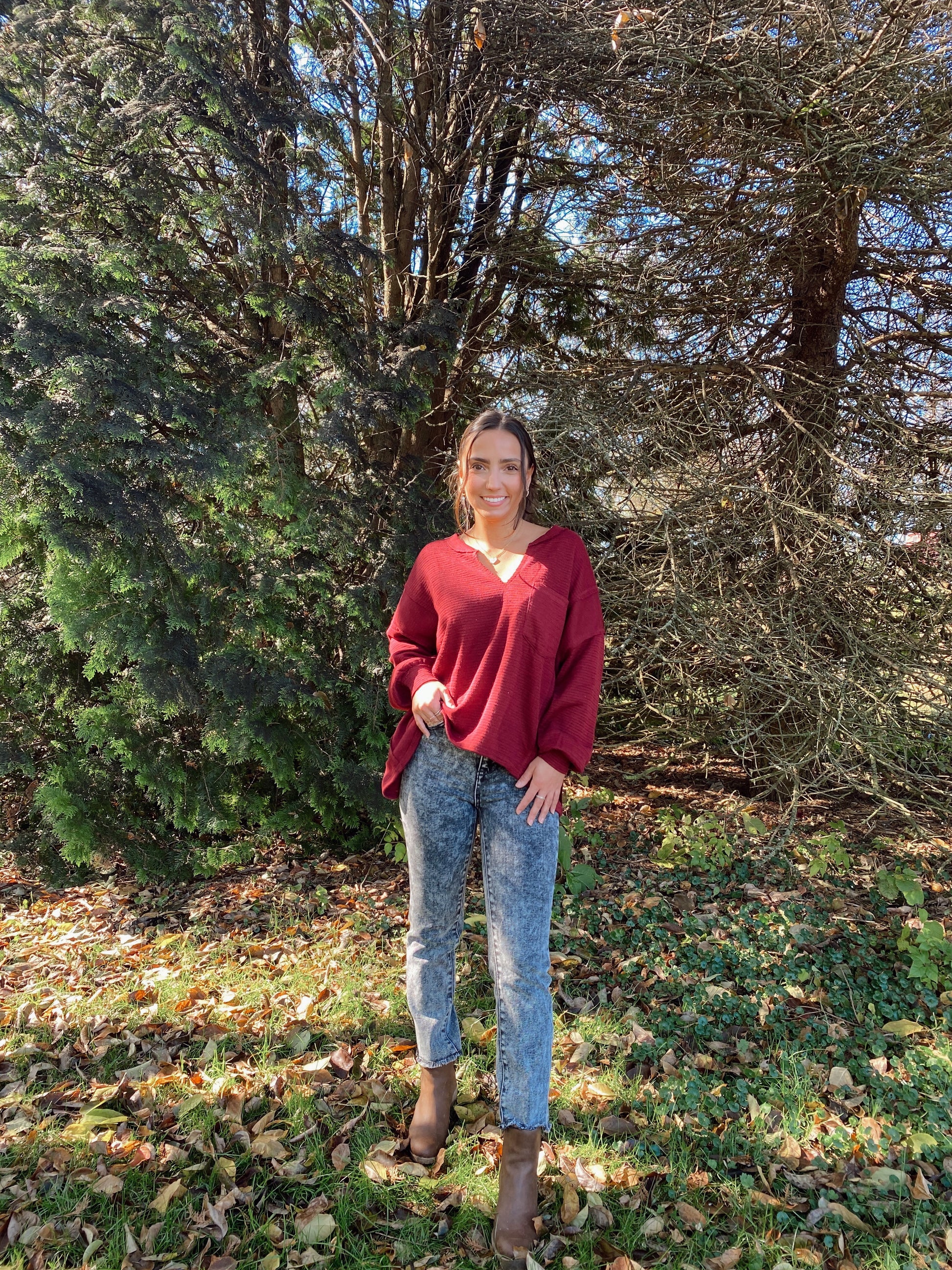 This Berry Bright Top in a perfect fall-winter color is a must-have for your wardrobe! Its v-neck style and longer fit in the back provide both comfort and style. Look and feel your best all season long!