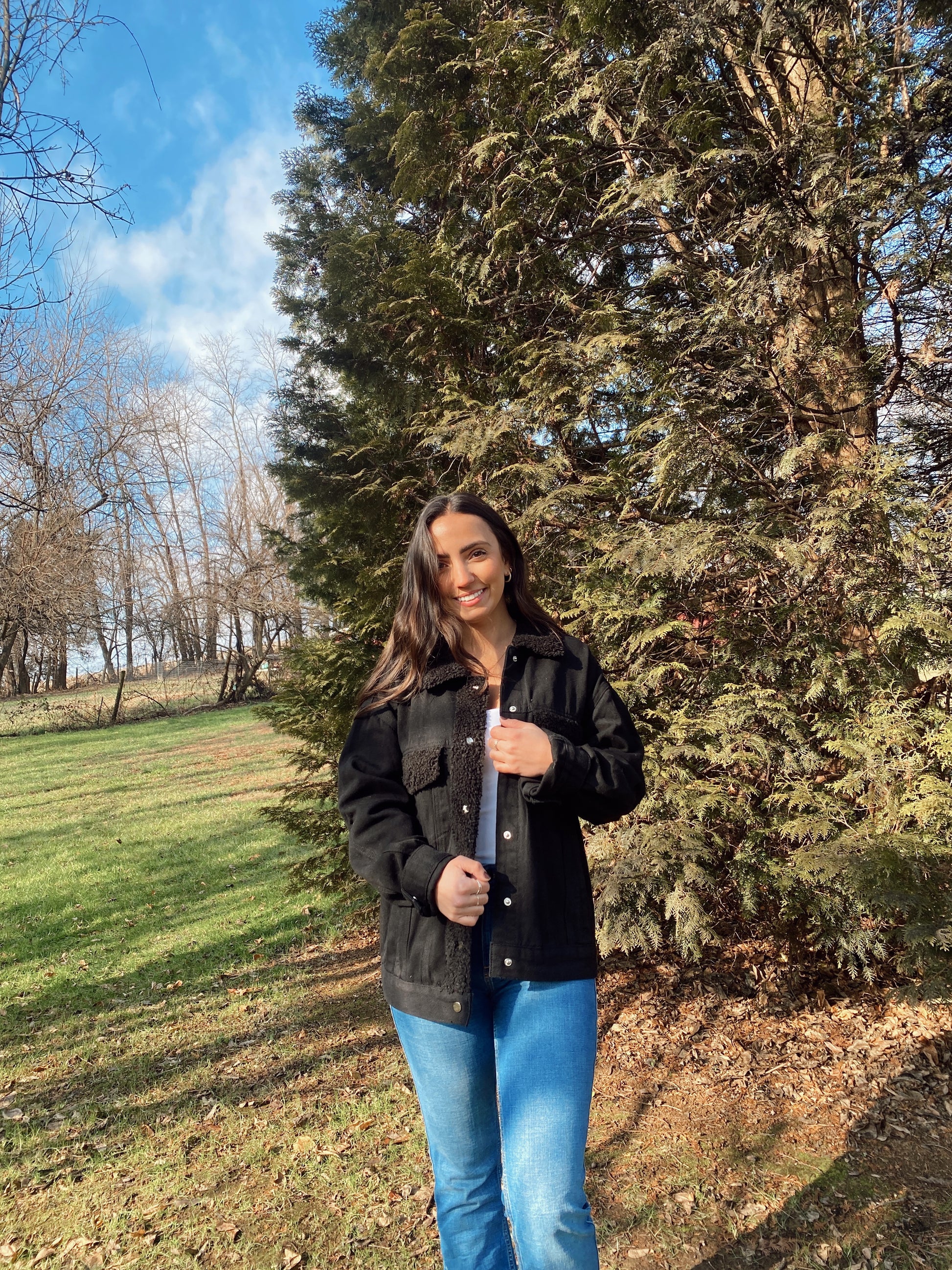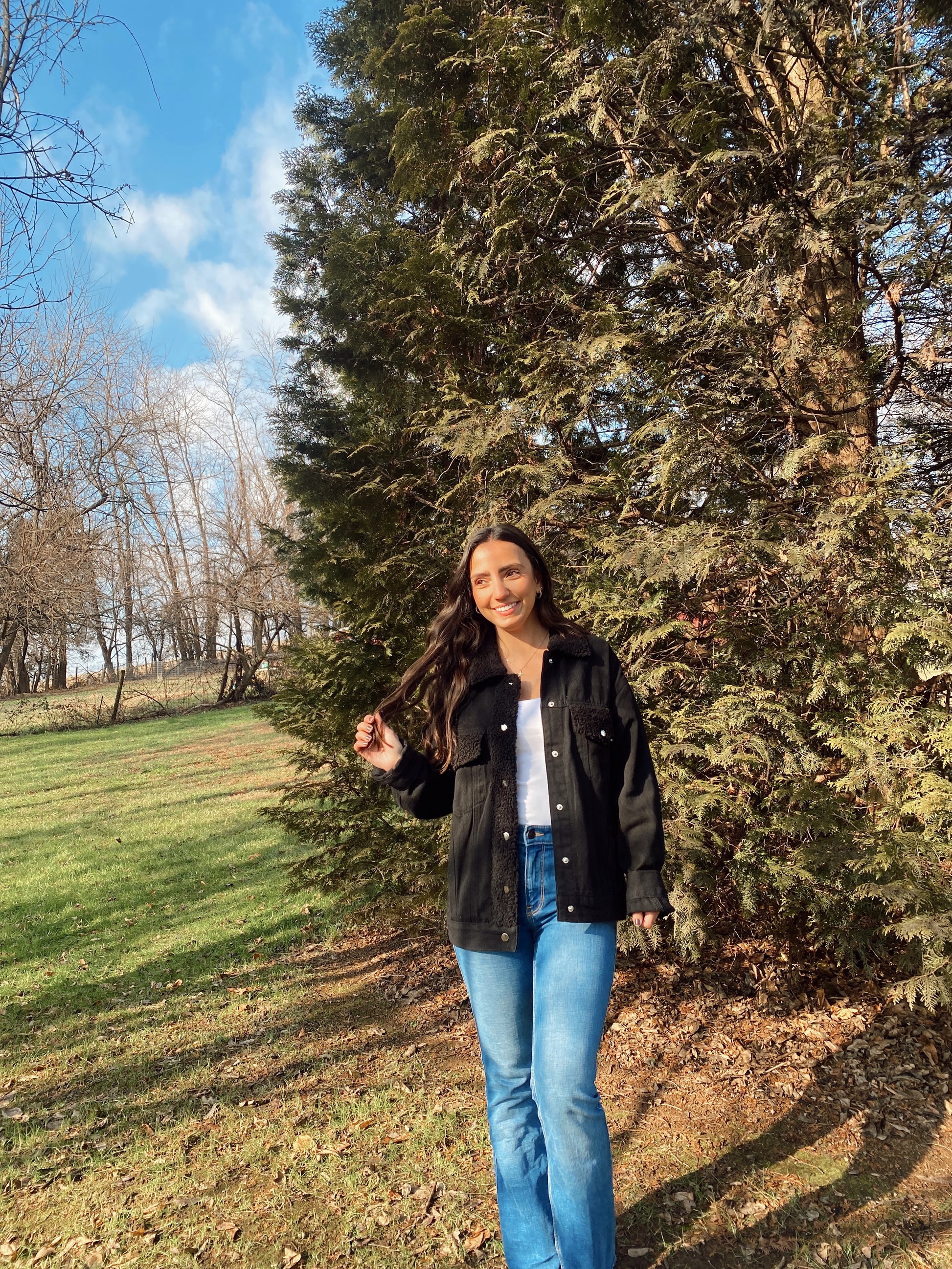 Elevate your style with the Sherpa Denim Jacket! This classic black jacket features cozy sherpa detailing, snap button closure, and a full-length style that fits true to size. A staple must-have for any wardrobe, this jacket will keep you warm and stylish all season long.
